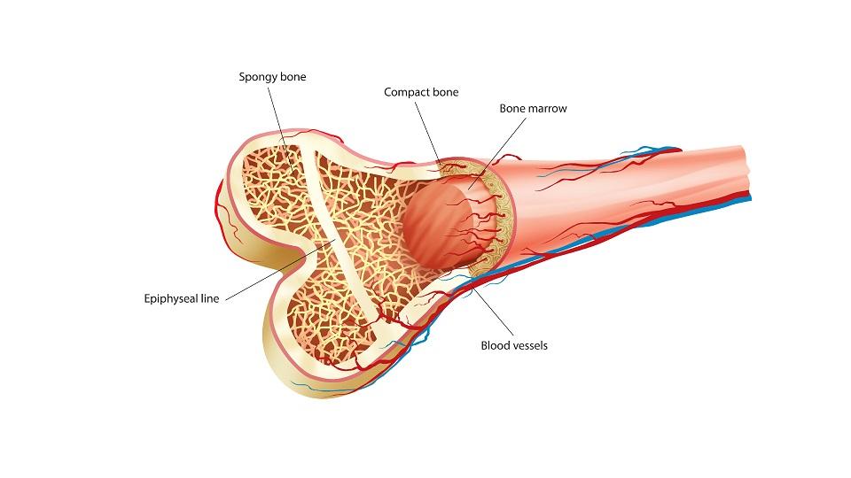 Spongy bone (cancellous bone) Compact bone (cortical bone) Bone marrow Epiphyseal line (growth plate remnant) Blood vessels (arteries and veins)