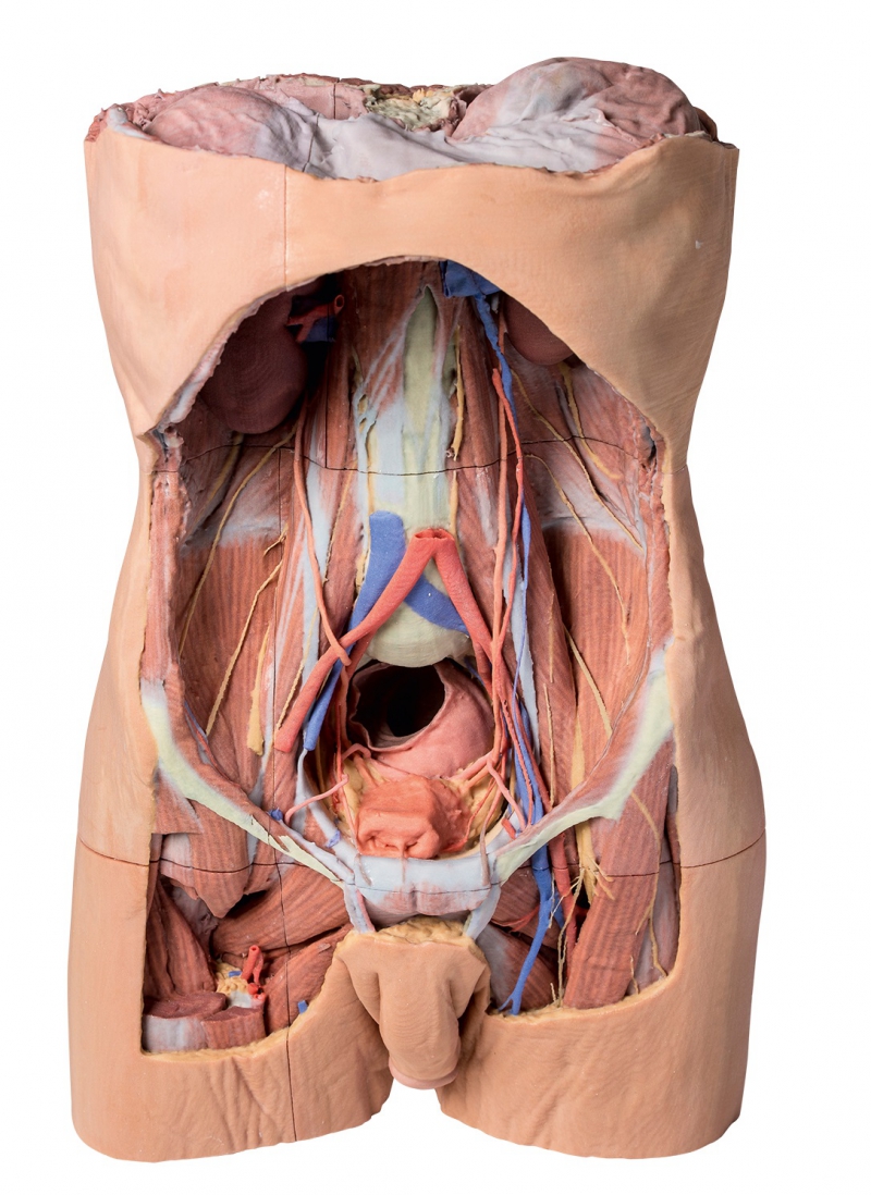 This highly detailed anatomical model provides an in-depth, deep dissection view of the female pelvis and lower abdominal wall, emphasizing the complex arrangement of organs